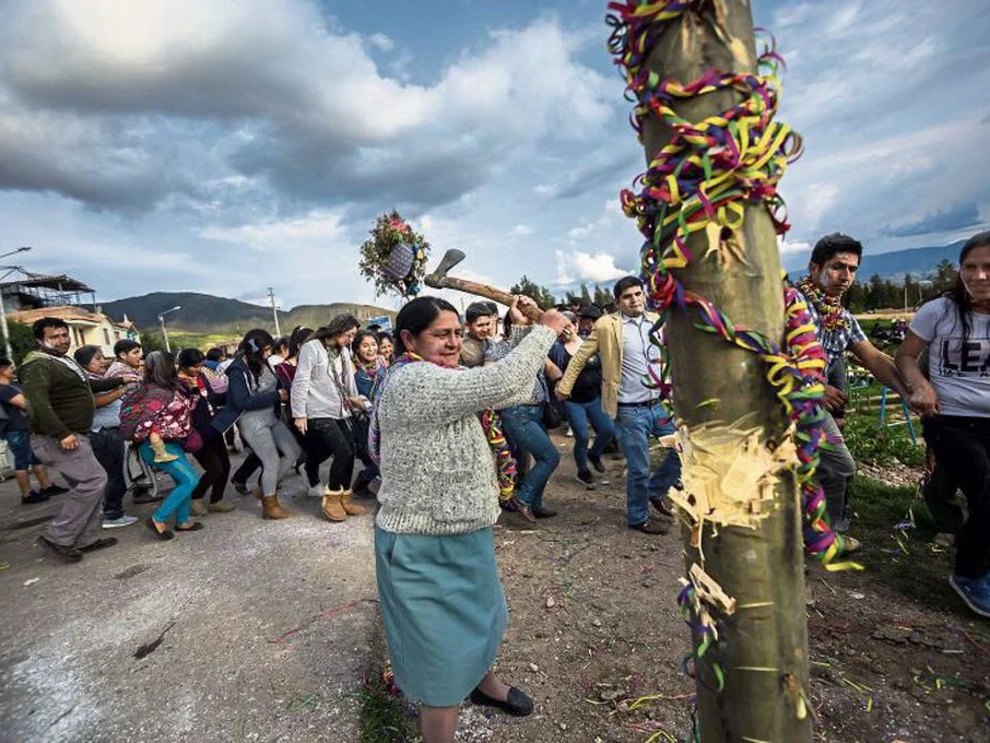 The Yunza: A tall tree in an open space, decorated with balloons, streamers, buckets of water, and hanging gifts that children and adults will later scramble to collect. Communities gather in a circle, dancing around the tree while taking turns swinging an axe at its trunk. When the tree goes down, the crowd rushes forward to grab the gifts, and the person who lands the final blow becomes next year’s host.