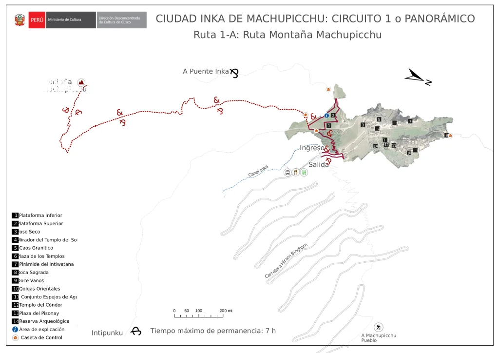 - Circuit 1 A is for those who wish to hike to Machu Picchu Mountain. First you will hike to the Guardhouse above Machu Picchu, here you will get the perfect postcard pictures of Machu Picchu. The hike to Machu Picchu Mountain is around 3 hours round trip and is considered a moderate to difficult hike.