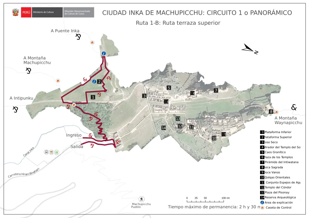 - Circuit 1 B This is the shortest route at Machu Picchu. The hike includes the Guardhouse for great photo opportunities of the ancient Inca citadel. Spend time enjoying the views spread before you.