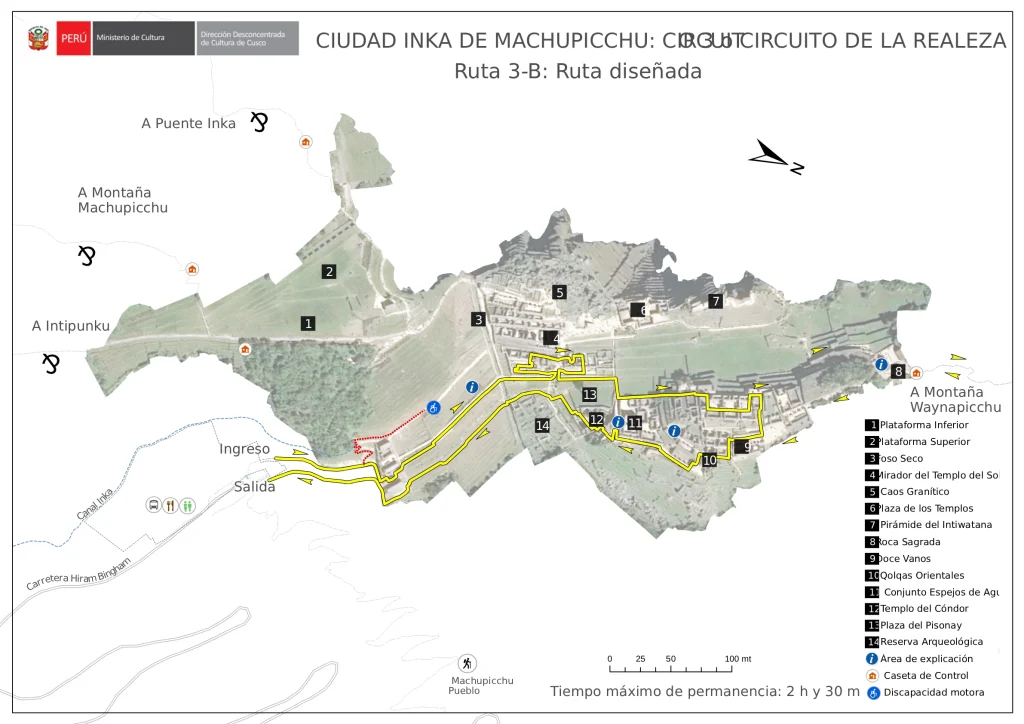 - Circuit 3B, this circuit includes the lower part of Machu Picchu only. Visit the sites of Temple of the Sun, The Inca House and the Temple of the Condor. You will need a guide to complete your tour of Machu Picchu.