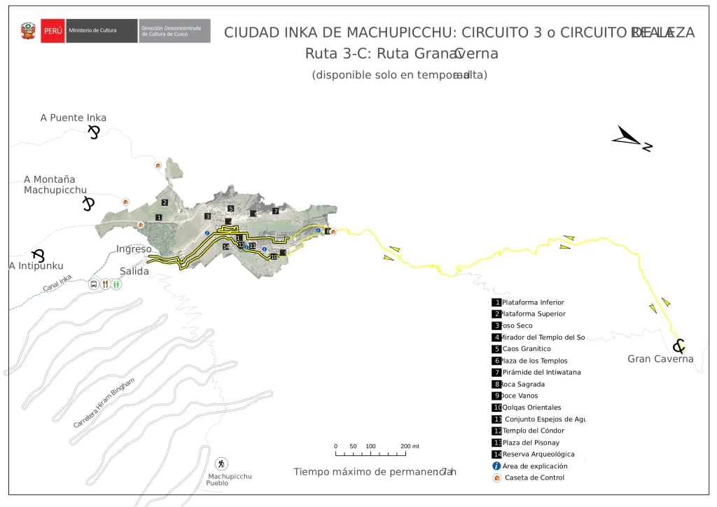 - Circuit 3C, again this circuit visits the lower part of Machu Picchu including the sites mentioned above. Plus a visit to the Big Cave (templo of the moon), this applies ONLY if you have Huyna Piccu tickets.