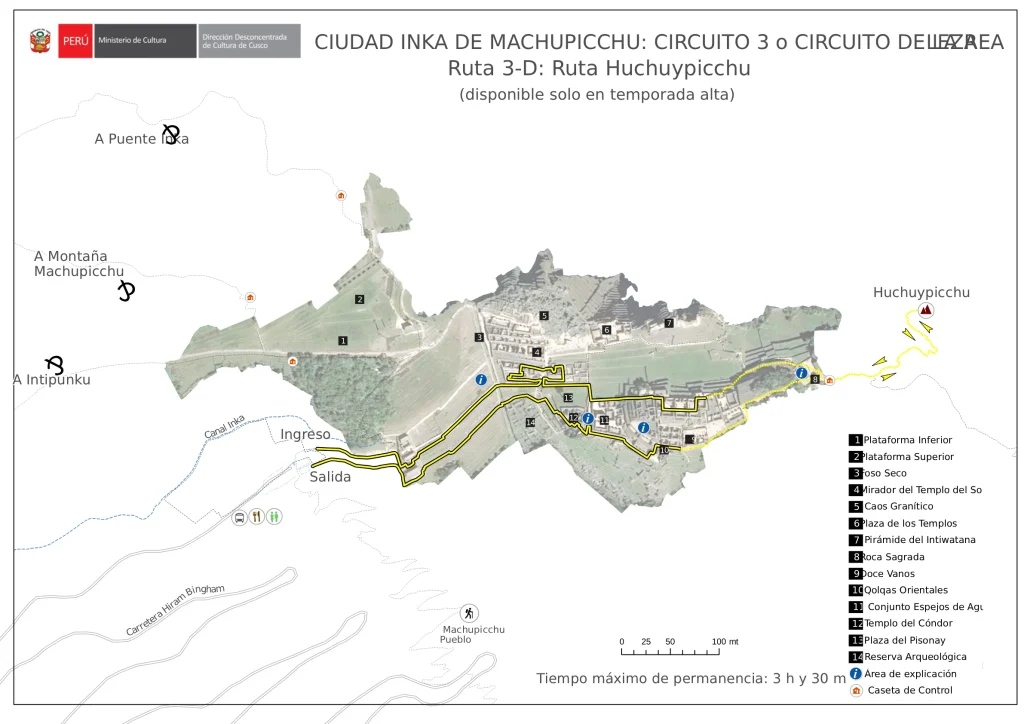 - Circuit 3D, this circuit take you to Huchuy Picchu Mountain. A short hike that is new to the Machu Picchu area. The site has great views and does not take a lot of effort. As part of circuit 3D you will visit the lower part of Machu Picchu with a guide