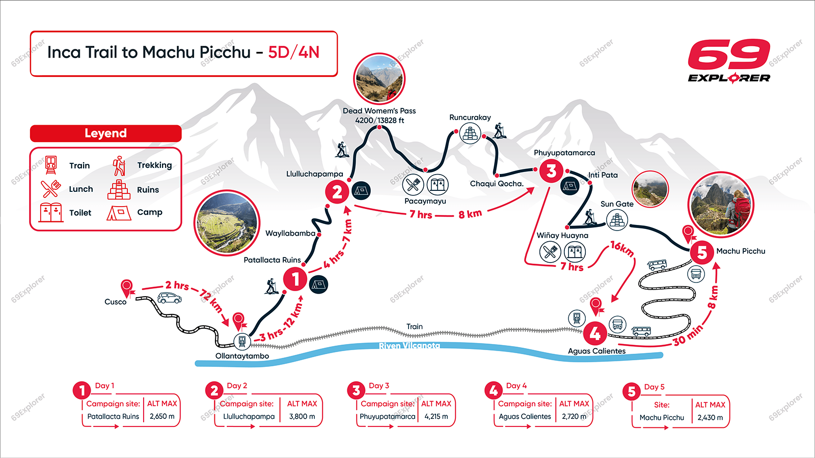 Over the course of four days, traverse a variety of terrains. These range from challenging mountain passes to serene cloud forests, with each offering their own unique beauty and challenges. The trail covers roughly 43 kilometers (about 26.7 miles), a distance filled with breathtaking vistas and ancient Inca ruins.